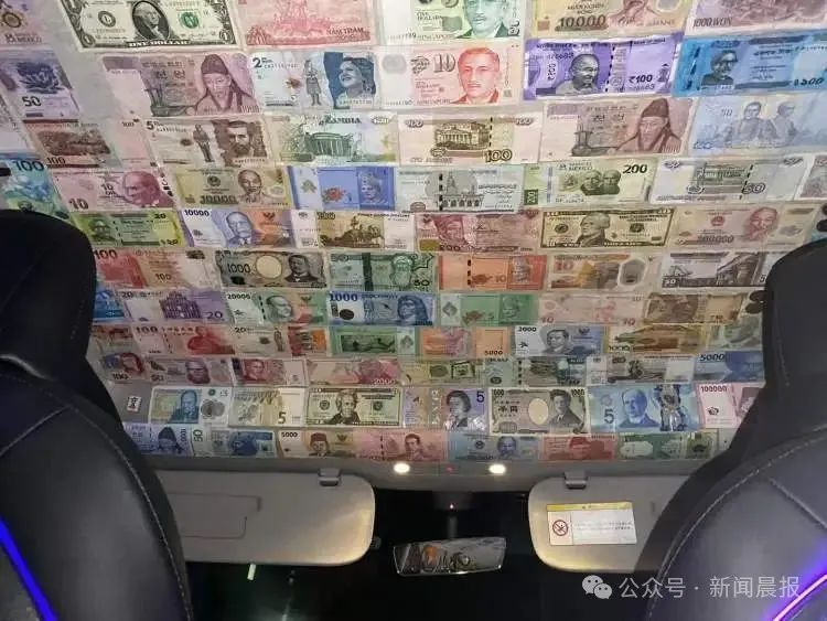 你们可以看到我车厢的顶部,现在已经快被各个国家的纸币贴满了,其实也就用了一年时间。有些乘客会给我大面额的纸币,我肯定不敢往上贴。